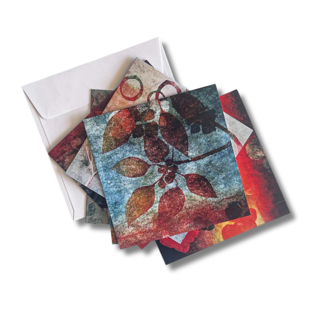 These cards are reproductions of original works created using mixed print media. Each piece comprises multiple layers through collaged plant prints and etching and monotypes.